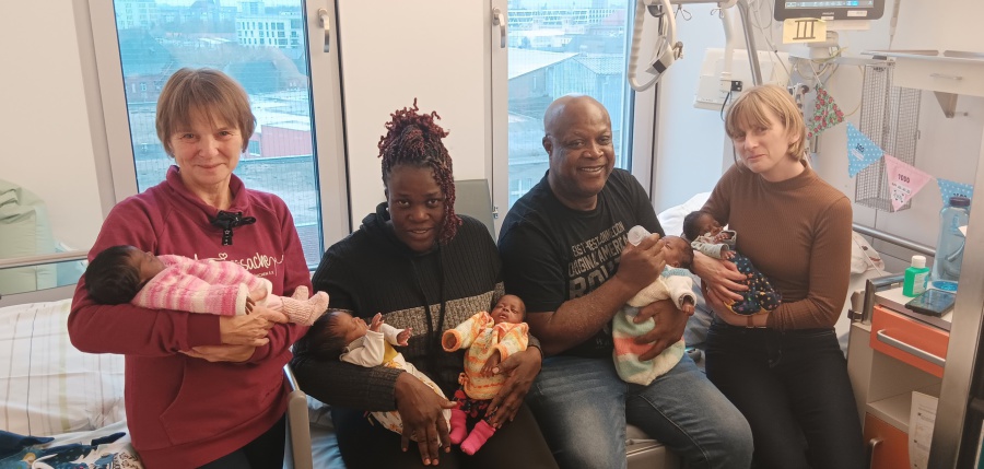 Kurz vor diesem wichtigen Schritt nach Hause erhielt die Familie besonderen Besuch: Eine Vertreterin der Elterninitiative des Fördervereins für frühgeborene Kinder an der Charité gratulierte den Eltern persönlich und informierte über die Unterstützungsangebote des Fördervereins. Im Mittelpunkt stand dabei „Eltern helfen Eltern“, eine Initiative die betroffenen Familien mit frühgeborenen Kindern Austausch, Orientierung und Ermutigung auch nach der Entlassung anbietet. Begleitet wurde sie von einer Vertreterin des Vereins Herzenssache, die liebevoll handgenähte Kleidung für die fünf kleinen Frühstarter überreichte. Die winzigen farbenfrohen Kleidungsstücke sorgten für große Freude und berührende Momente. Solche Begegnungen zeigen, wie wertvoll gelebte Solidarität, ehrenamtliches Engagement und verlässliche Netzwerke für Familien mit frühgeborenen Kindern sind. Wir wünschen der Familie einen behüteten Start ins gemeinsame Leben zu Hause.