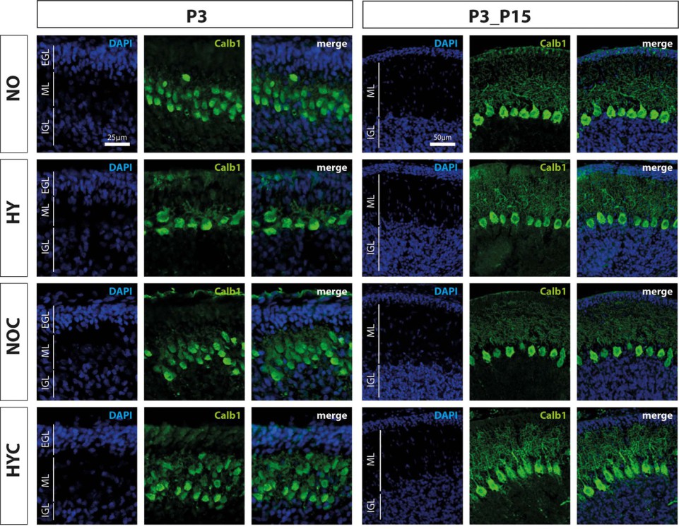 Abbildung: Repräsentative kortikale mit dem Purkinje-Zellmarker Calbindin und DAPI immunhistochemisch gefärbte Kleinhirn-Schnitte neugeborener Ratten, die Normoxie (NO) oder Hyperoxie (HY) ausgesetzt waren, im Vergleich zu Rattenwelpen, die mit Koffein behandelt wurden (NOC, HYC). Die Untersuchungen wurden am postnatalen Tag 3 (P3) oder nach der Genesung nach 3-tägiger Exposition bei P15 durchgeführt. Immunfluoreszenzbilder zeigen Calbindin (Calb1, grün) und Zellkerne (DAPI, blau). EGL: external granular layer; ML: molecular layer; IGL: internal granular layer.